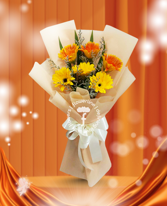 The bouquet comes with 6 stems of colorful Gerberas and fillers. The flowers are tied with waterproof paper wrappers plus a satin ribbon.