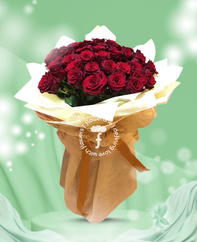 The bouquet comes with 50 stems of red Ecuadorian Roses and fillers. The flowers are tied with abaca and non-woven wrappers plus a satin ribbon.