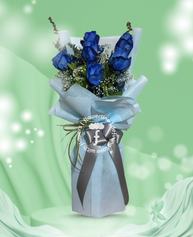 The bouquet comes with 6 stems of blue Bangkok Roses and fillers. The flowers are tied with nonwoven wrappers and satin ribbon.