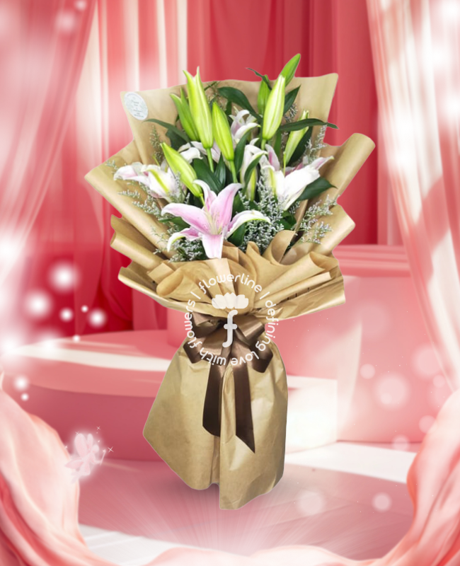 The bouquet comes with 3 stems of Lilies and fillers. The flowers are tied with nonwoven wrappers and ribbon.