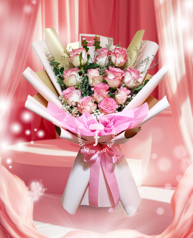 The bouquet comes with 1 dozen stems of Bangkok Roses and fillers. The flowers are tied with nonwoven and waterproof paper wrappers plus a satin ribbon.