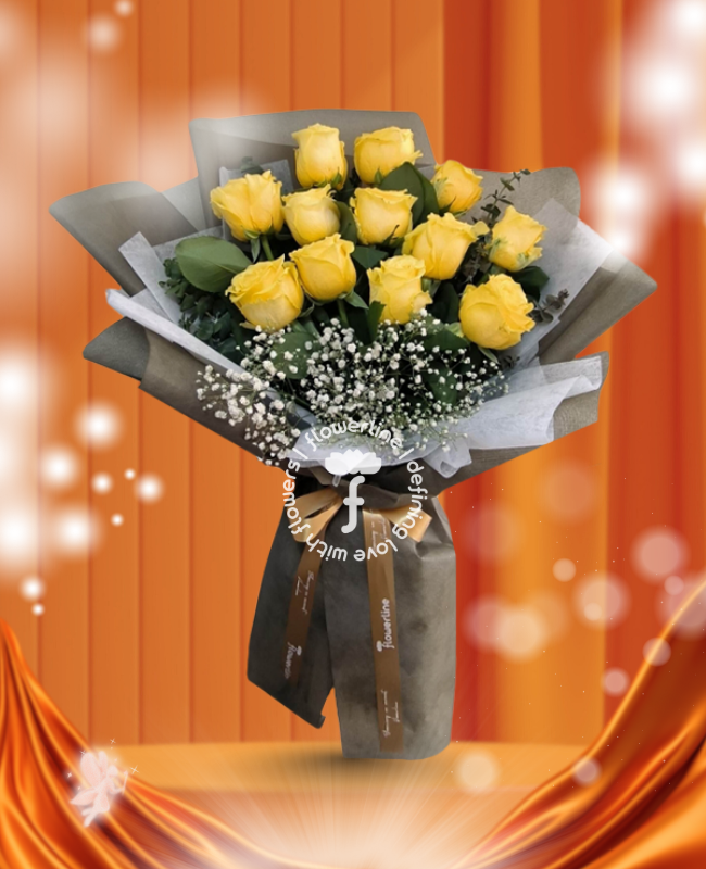 The bouquet comes with 1 dozen stems of Bangkok Roses and fillers. The flowers are tied with nonwoven wrappers plus a ribbon.
