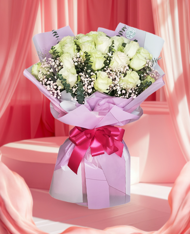 The bouquet comes with 2 dozen stems of Bangkok Roses and fillers. The flowers are tied with nonwoven and waterproof paper wrappers plus a satin ribbon.