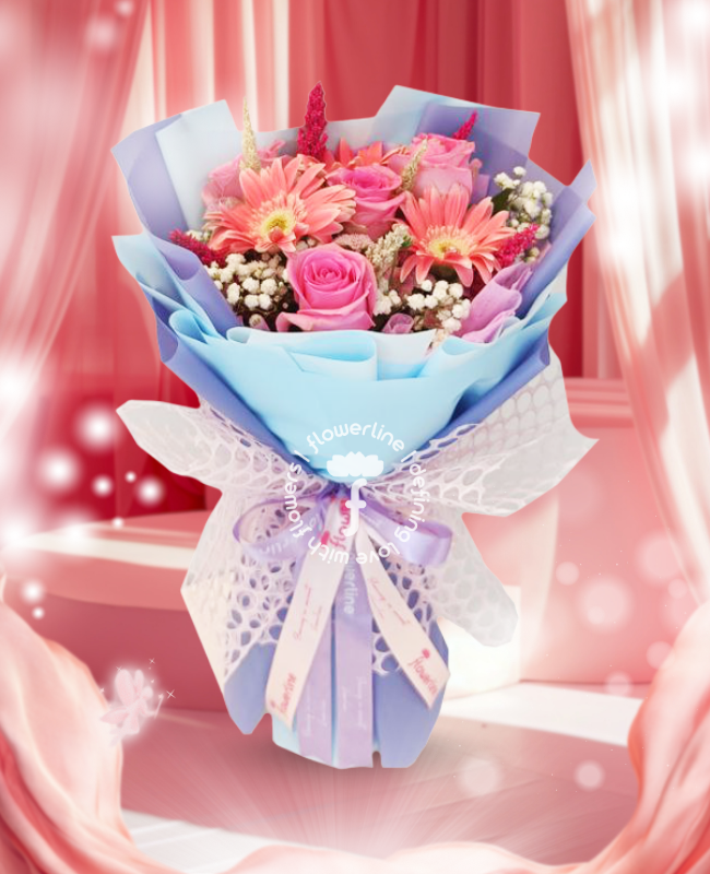 The bouquet comes with 4 stems of Bangkok Roses, 3 stems of Gerberas and fillers. The flowers are tied with nonwoven wrappers and satin ribbon.