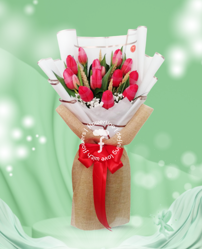 The bouquet comes with 1 dozen stems of Tulips and fillers. The flowers are tied with waterproof paper wrapper and satin ribbon.
