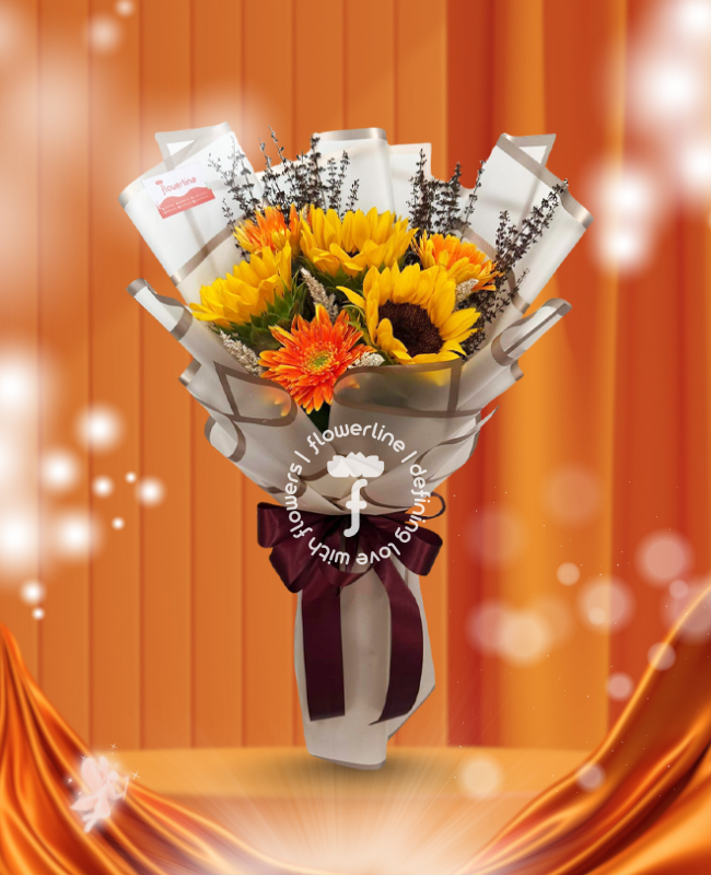 A beautifully crafted bouquet composed of Sunflowers, Gerberas, and fillers. The flowers are tied with nonwoven wrappers and satin ribbon.