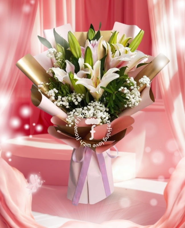 The bouquet comes with 3 stems of Lilies and fillers. The flowers are tied with nonwoven wrappers and ribbon.