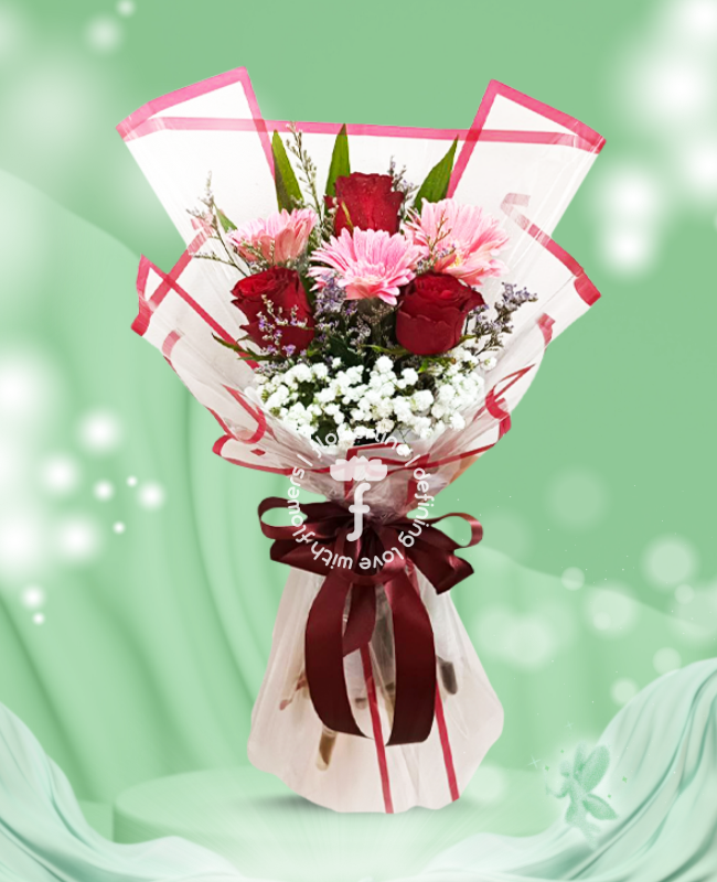 The bouquet comes with 6 stems of Bangkok Roses, Gerberas and fillers. The flowers are tied with waterproof paper wrappers plus a satin ribbon.