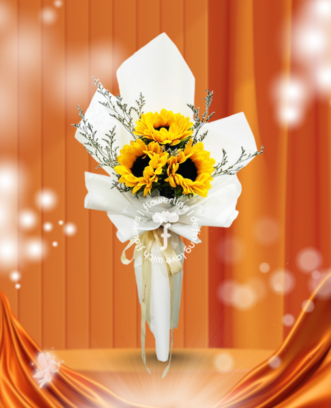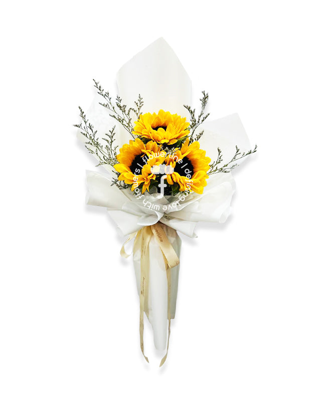 The bouquet comes with 3 stems of Sunflowers and fillers. The flowers are tied with nonwoven and burlap wrappers plus a ribbon.