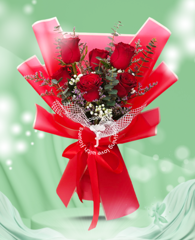 The bouquet comes with 6 stems of Ecuadorian Roses and fillers. The flowers are tied with nonwoven wrappers and a satin ribbon.