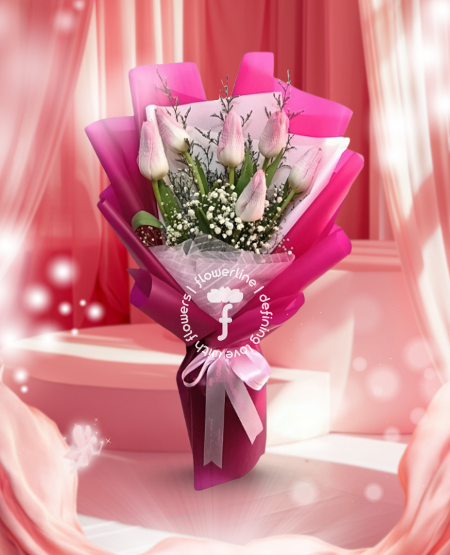 The bouquet comes with 6 stems of Tulips and fillers. The flowers are tied with nonwoven wrapper and satin ribbon.