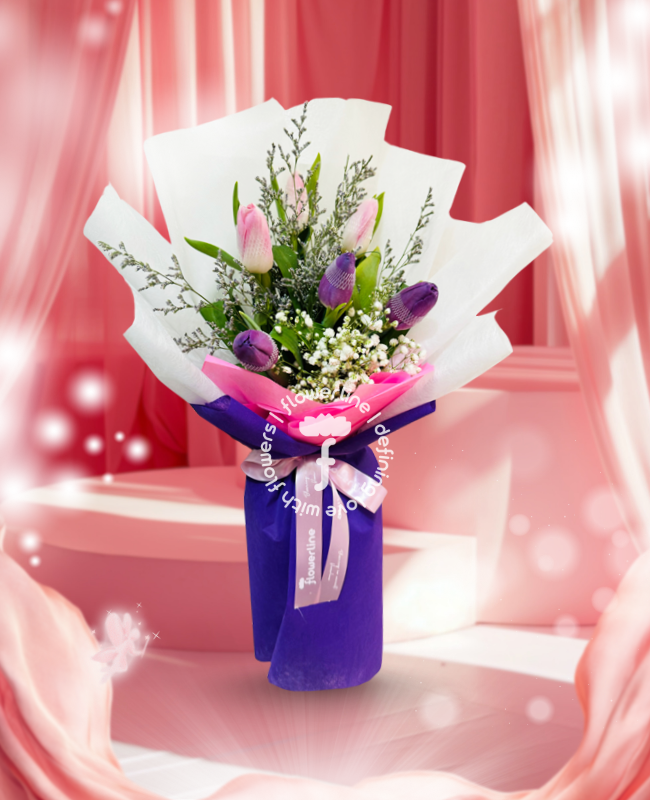 The bouquet comes with 6 stems of Tulips and fillers. The flowers are tied with nonwoven wrapper and satin ribbon.