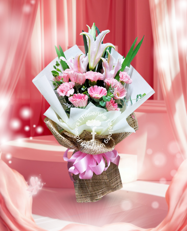 A bouquet with 1 stem of Lilies, 1 dozen stems of Carnations and Gerberas along with fillers. The flowers are tied with nonwoven and burlap wrappers plus satin ribbon.