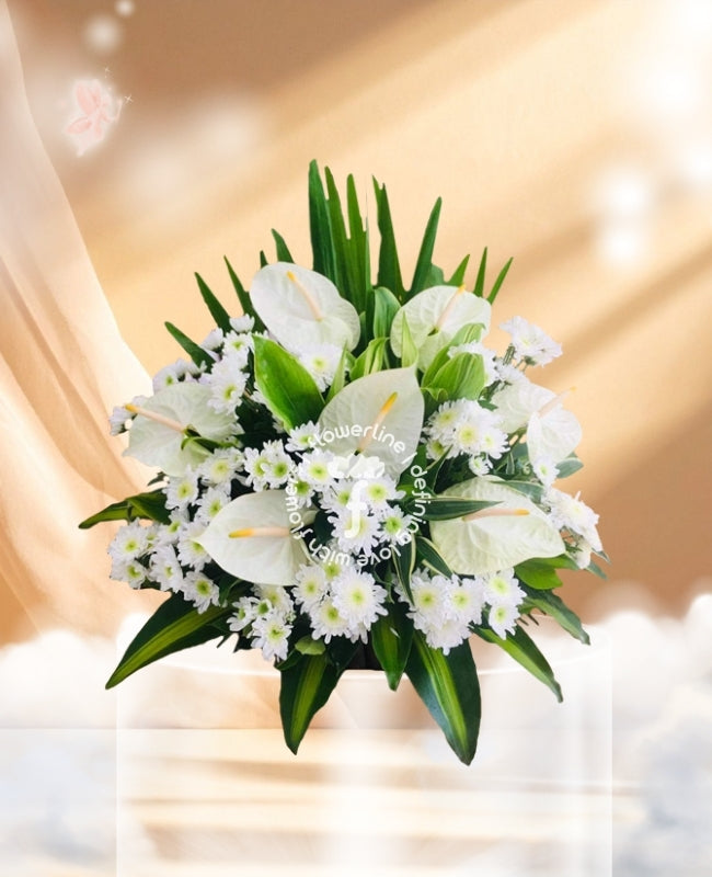 Express your sincerest condolences with this exquisite funeral flowers basket arrangement. Expertly crafted with the highest quality materials and attention to detail, this stunning flowers will be an elegant and tasteful tribute to the departed. Meticulous details and fine textures create a sophisticated and timeless representation of love and respect.