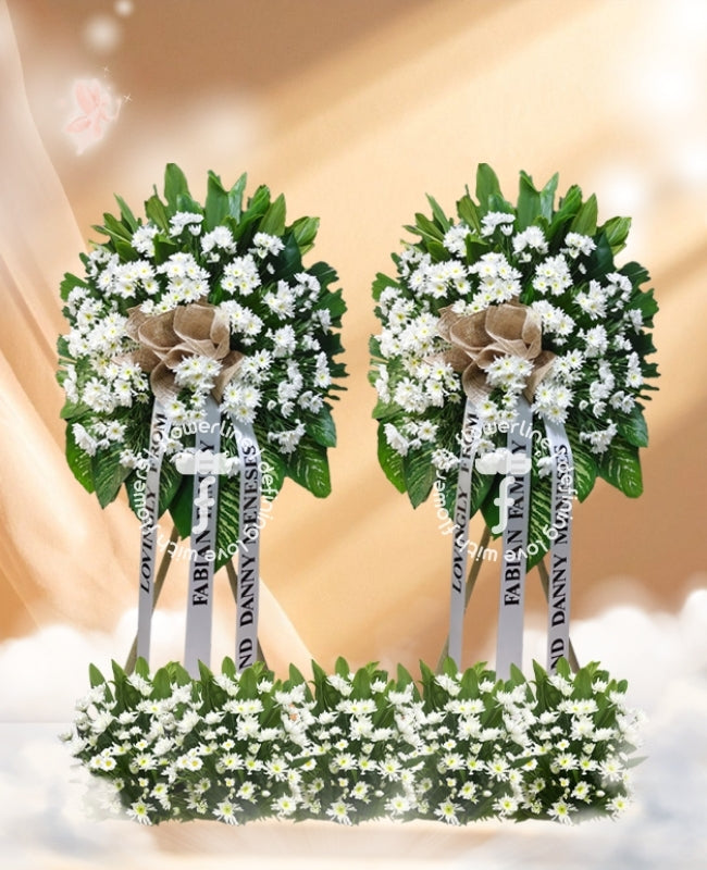 Deliver your most heartfelt sympathies with this exquisite set of funeral flower arrangement. Expertly crafted with the utmost quality materials and a meticulous attention to detail, these stunning blossoms will make a tasteful and elegant tribute to the departed. Fine textures and intricate detailing provide a timeless symbol of love and reverence.
