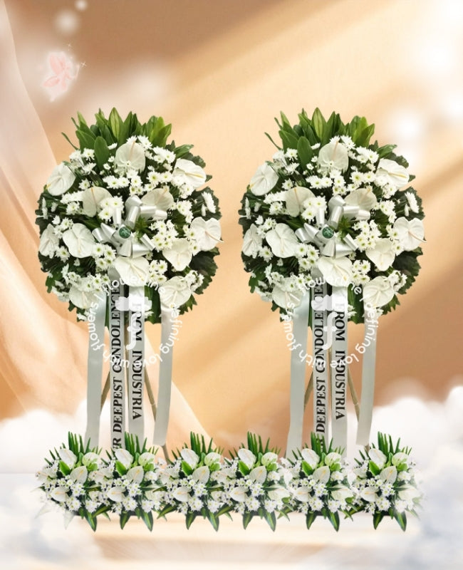 Deliver your most heartfelt sympathies with this exquisite set of funeral flower arrangement. Expertly crafted with the utmost quality materials and a meticulous attention to detail, these stunning blossoms will make a tasteful and elegant tribute to the departed. Fine textures and intricate detailing provide a timeless symbol of love and reverence.