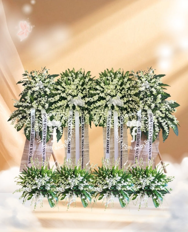 Deliver your most heartfelt sympathies with this exquisite set of funeral flower arrangement. Expertly crafted with the utmost quality materials and a meticulous attention to detail, these stunning blossoms will make a tasteful and elegant tribute to the departed. Fine textures and intricate detailing provide a timeless symbol of love and reverence.
