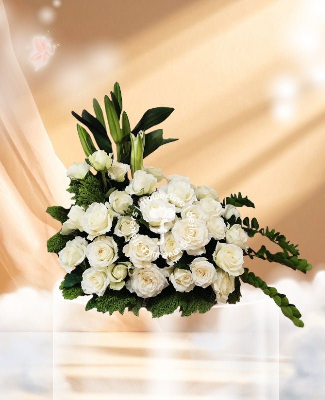 Express your sincerest condolences with this exquisite funeral flowers pot arrangement. Expertly crafted with the highest quality materials and attention to detail, this stunning flowers will be an elegant and tasteful tribute to the departed. Meticulous details and fine textures create a sophisticated and timeless representation of love and respect.