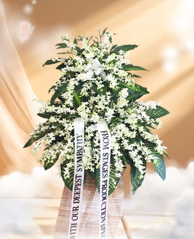 Express your sincerest condolences with this exquisite funeral flowers - two layers stand arrangement. Expertly crafted with the highest quality materials and attention to detail, this stunning flowers will be an elegant and tasteful tribute to the departed. Meticulous details and fine textures create a sophisticated and timeless representation of love and respect.