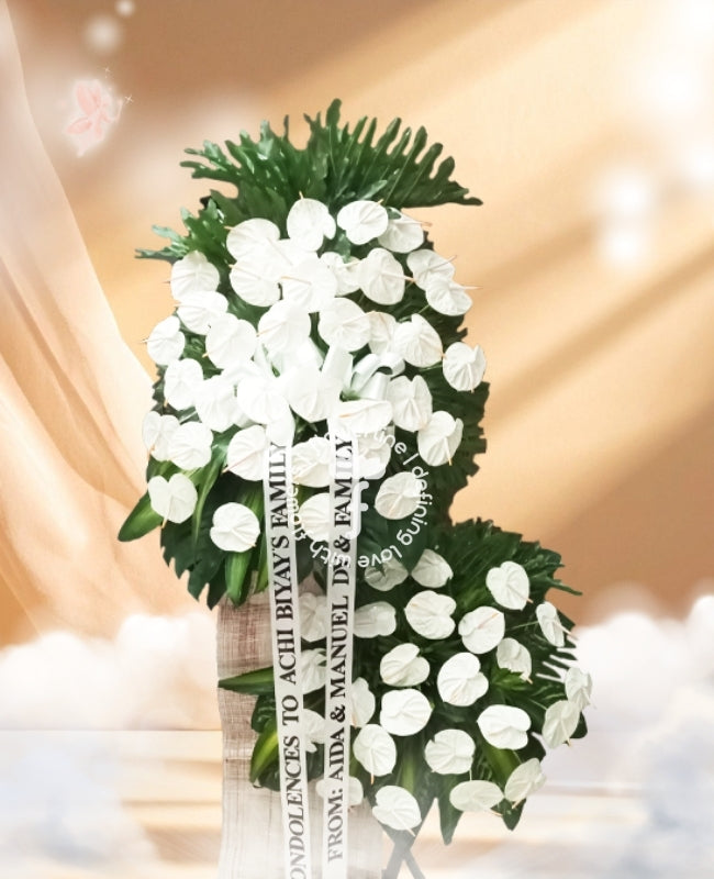 Express your sincerest condolences with this exquisite funeral flowers - two layers stand arrangement. Expertly crafted with the highest quality materials and attention to detail, this stunning flowers will be an elegant and tasteful tribute to the departed. Meticulous details and fine textures create a sophisticated and timeless representation of love and respect.