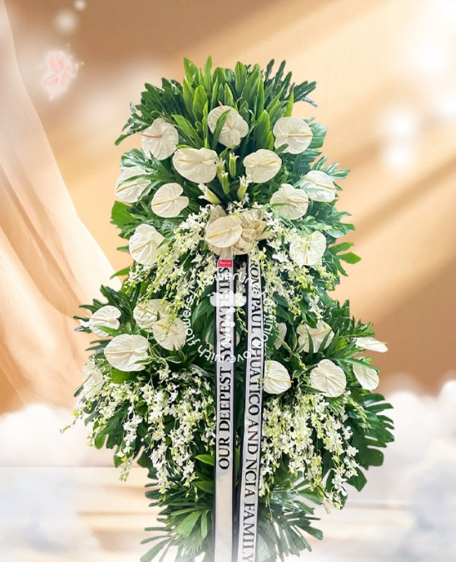 Express your sincerest condolences with this exquisite funeral flowers - three layers stand arrangement. Expertly crafted with the highest quality materials and attention to detail, this stunning flowers will be an elegant and tasteful tribute to the departed. Meticulous details and fine textures create a sophisticated and timeless representation of love and respect.