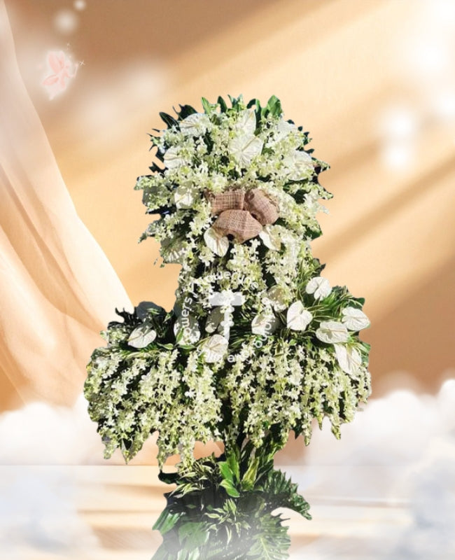 Express your sincerest condolences with this exquisite funeral flowers - three layers stand arrangement. Expertly crafted with the highest quality materials and attention to detail, this stunning flowers will be an elegant and tasteful tribute to the departed. Meticulous details and fine textures create a sophisticated and timeless representation of love and respect.