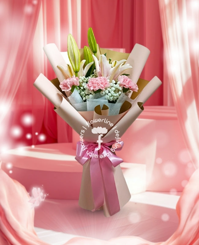 The bouquet comes with 1 stem of Lilies and 3 stems of Carnations along with fillers. The flowers are tied with nonwoven and burlap wrappers plus satin ribbon.