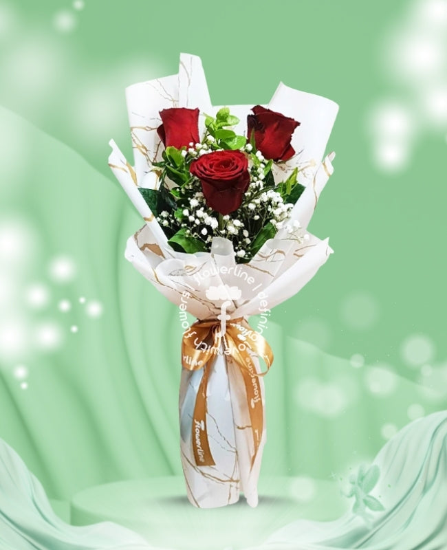 The bouquet comes with 3 stems of Bangkok Roses and fillers. The flowers are tied with nonwoven and waterproof paper wrappers plus a satin ribbon.