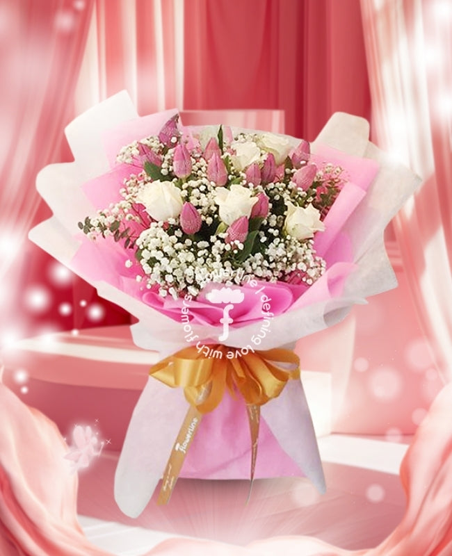 Tell your special someone how much you care with the Isla bouquet. An exquisite mix of tulips and imported roses, this stunning gift is sure to make their day extra special. Show them your love with this beautiful arrangement.
