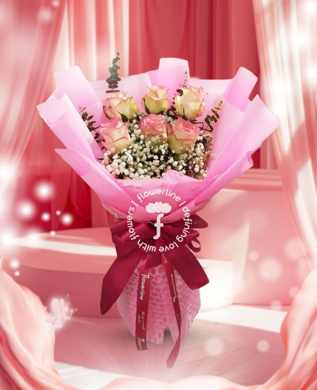 The bouquet comes with 6 stems of Bangkok Roses and fillers. The flowers are tied with abaca and burlap wrappers plus a ribbon.
