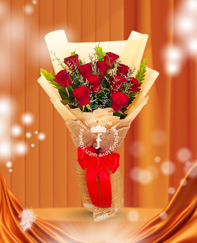 The bouquet comes with 1 dozen stems of Bangkok Roses and fillers. The flowers are tied with waterproof and burlap wrappers plus satin ribbon.
