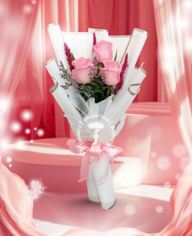 The bouquet comes with 3 stems of Bangkok Roses and fillers. The flowers are tied with nonwoven and waterproof paper wrappers plus a satin ribbon.