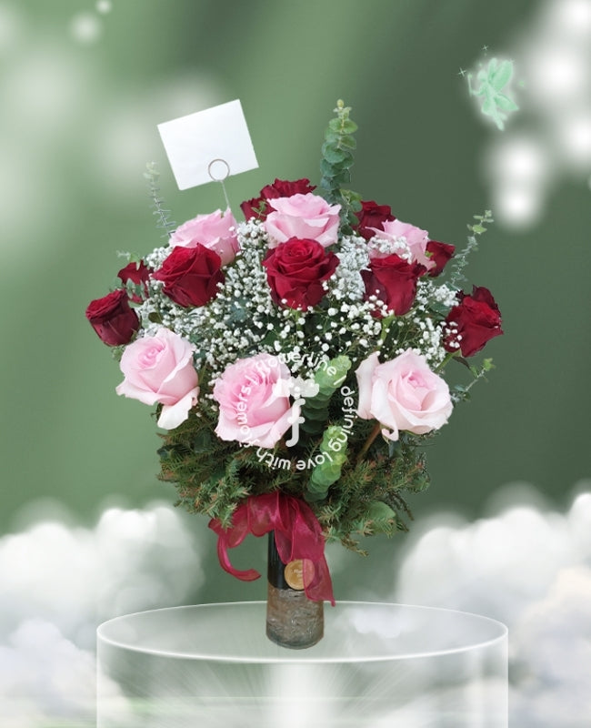 Our signature vase arrangement is composed of 18 stems of Bangkok Roses and fillers.