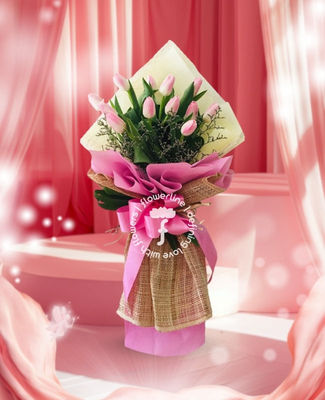 The bouquet comes with 1 dozen stems of Tulips and fillers. The flowers are tied with nonwoven and burlap wrappers plus satin ribbon.