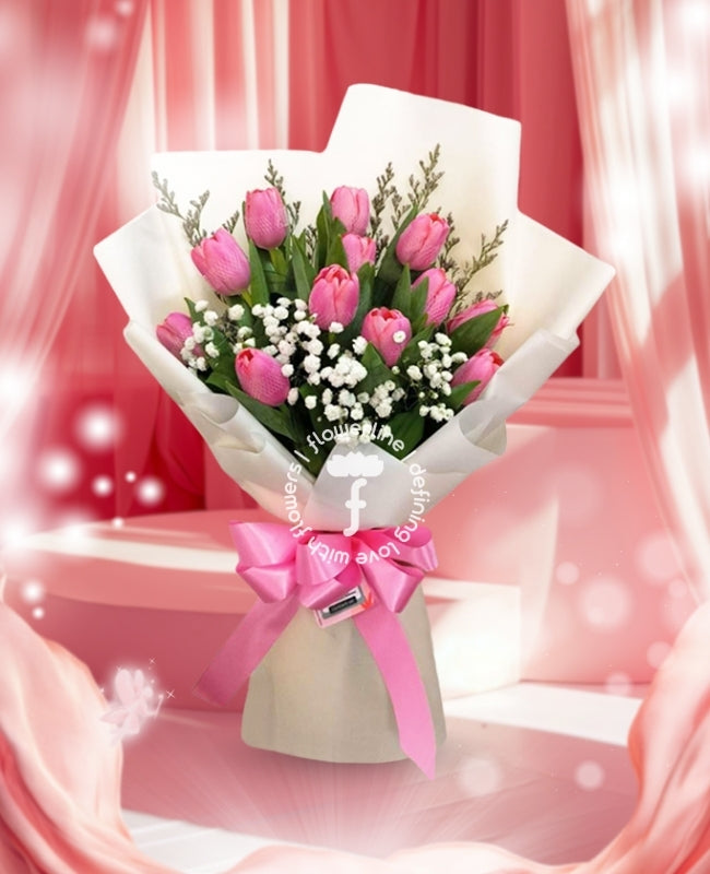 The bouquet comes with 1 dozen stems of Tulips and fillers. The flowers are tied with waterproof wrappers plus satin ribbon.