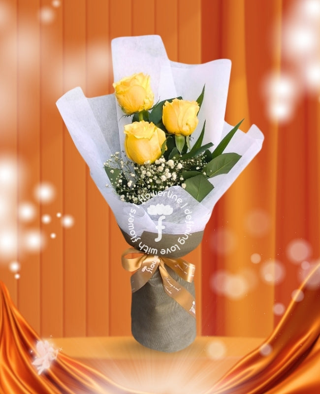 The bouquet comes with 3 stems of Ecuadorian Roses and fillers. The flowers are tied with nonwoven wrappers and satin ribbon.