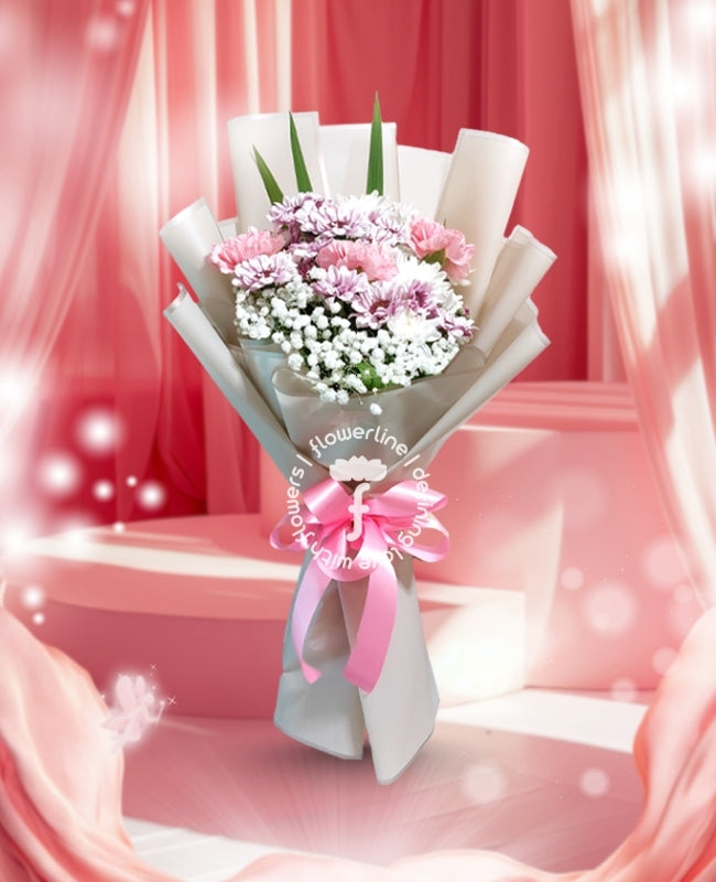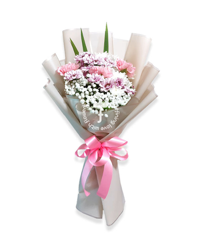 The bouquet comes with 3 stems of Carnations and 6 stems of Chrysanthemums and fillers. The flowers are tied with waterproof paper wrappers plus a satin ribbon.