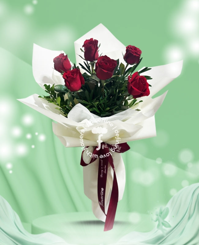A bouquet with 6 stems of Philippine Roses and fillers. The flowers are tied with waterproof paper wrappers plus a satin ribbon.