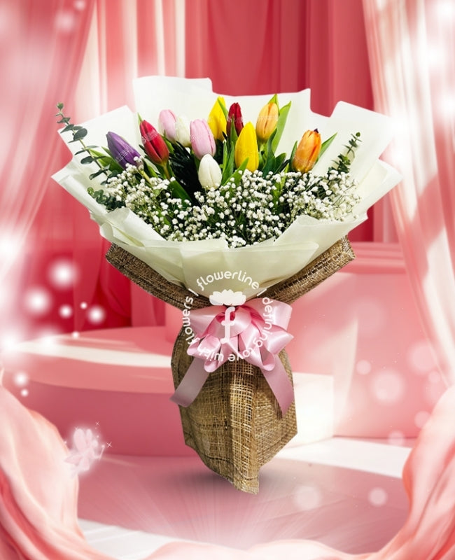 The bouquet comes with 2 dozen stems of Tulips and fillers. The flowers are tied with waterproof paper wrapper and satin ribbon.