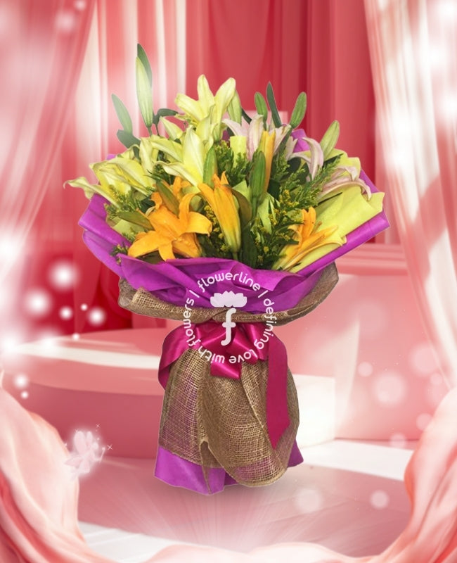 Add vibrancy to your life with Louise: the lily bouquet with classic style and bold colors. Get creative with this beautiful, eye-catching bouquet — it's sure to amuse and surprise, adding a splash of unique flair to any occasion. Louise is perfect for anyone wanting to make a statement!