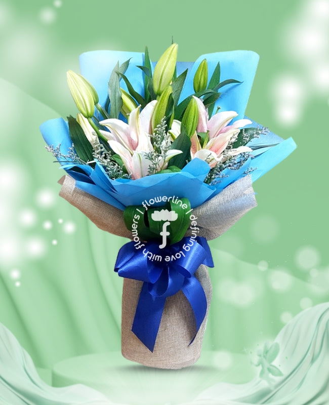 The bouquet comes with 3 stems of Lilies and fillers. The flowers are tied with nonwoven wrappers and ribbon.