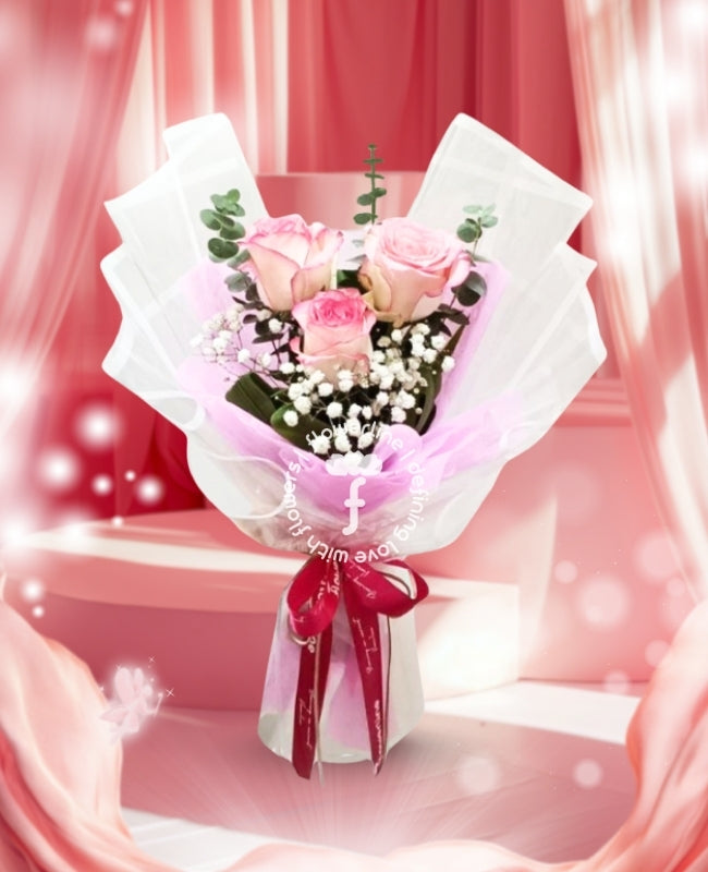 The bouquet comes with 3 stems of Bangkok Roses and fillers. The flowers are tied with nonwoven and waterproof paper wrappers plus a satin ribbon.