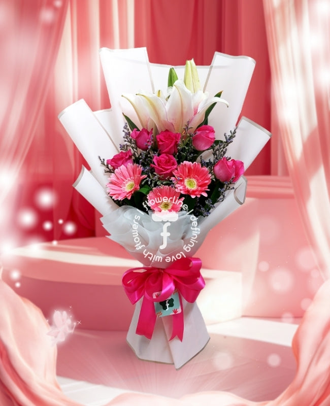 The bouquet comes with 1 stem of Lilies, 6 stems of Philippine Roses, 3 stems of Gerberas, and fillers. The flowers are tied with nonwoven and waterproof wrappers plus ribbon.