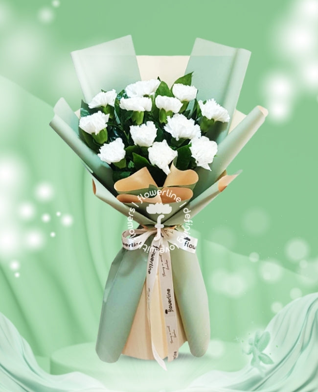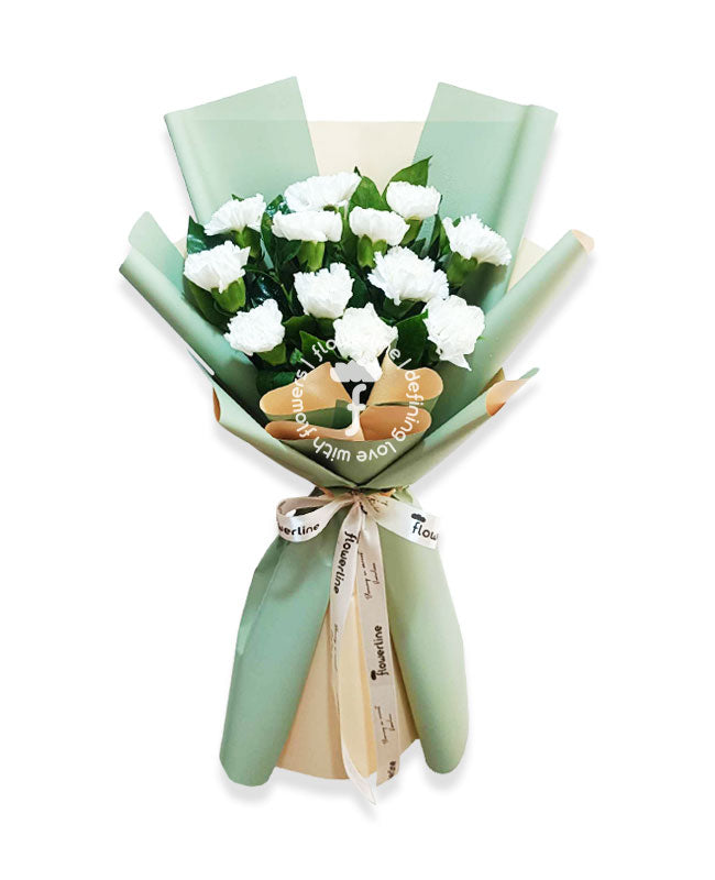 The bouquet comes with 1 dozen stems of Carnations and fillers. The flowers are tied with nonwoven and waterproof paper wrappers plus a satin ribbon.