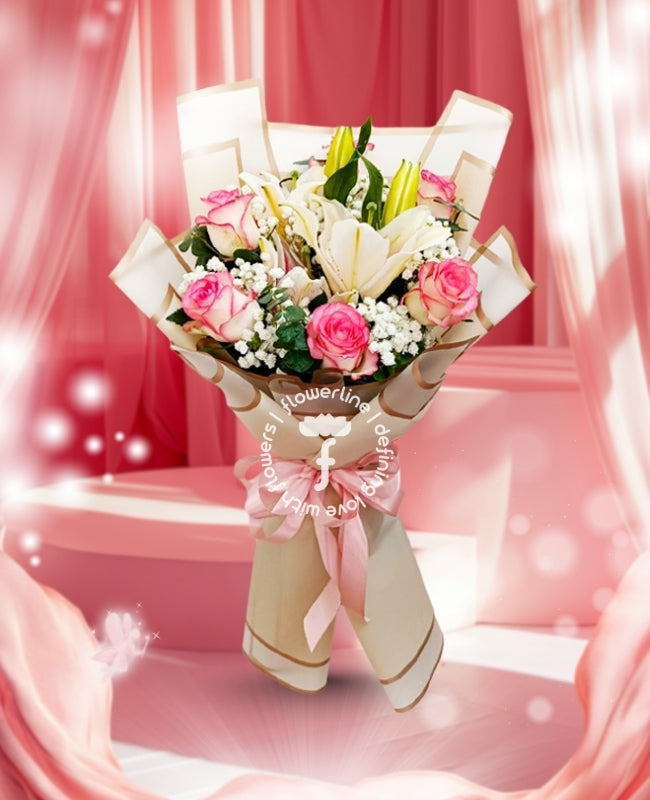 The bouquet comes with 1 stem of Lilies and 6 stems of Bangkok Roses along with fillers. The flowers are tied with nonwoven and burlap wrappers plus satin ribbon.