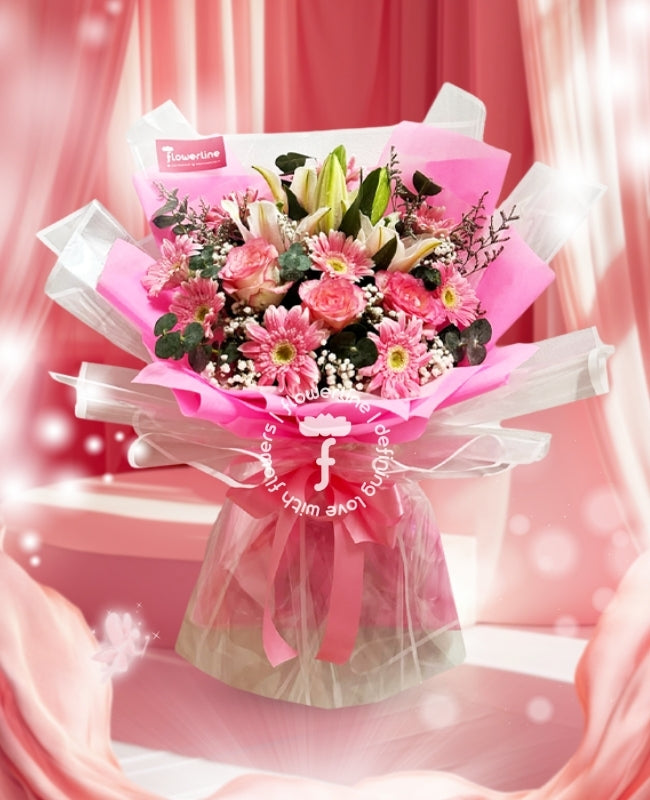 The bouquet comes with two-toned pink Bangkok Roses, Lilies, Gerberas, and fillers. The flowers are tied with mesh and nonwoven wrappers plus a satin ribbon.