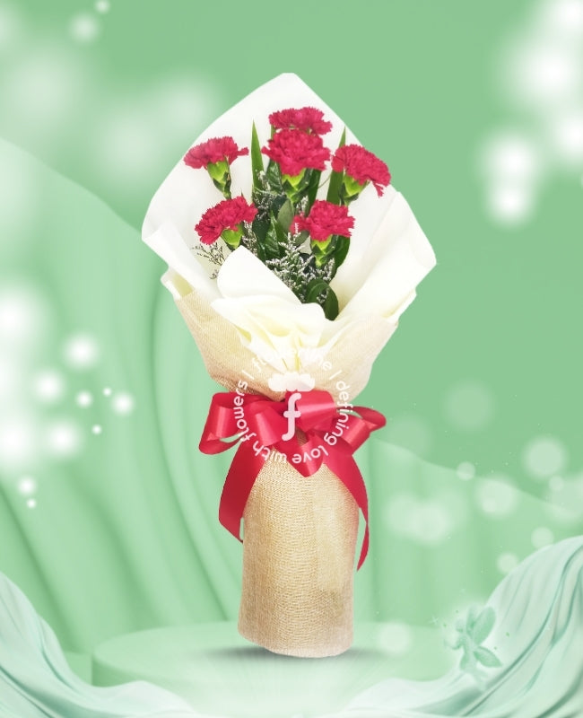 The bouquet comes with 6 stems of Carnations and fillers. The flowers are tied with nonwoven wrappers and satin ribbon.