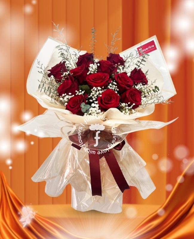 The bouquet comes with 1 dozen stems of Ecuadorian Roses and fillers. The flowers are tied with waterproof paper wrappers and satin ribbon.