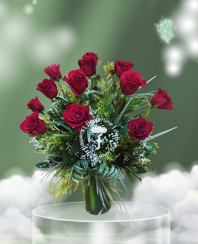 Our signature vase arrangement is composed of 1 dozen stems of Ecuadorian Roses and fillers.