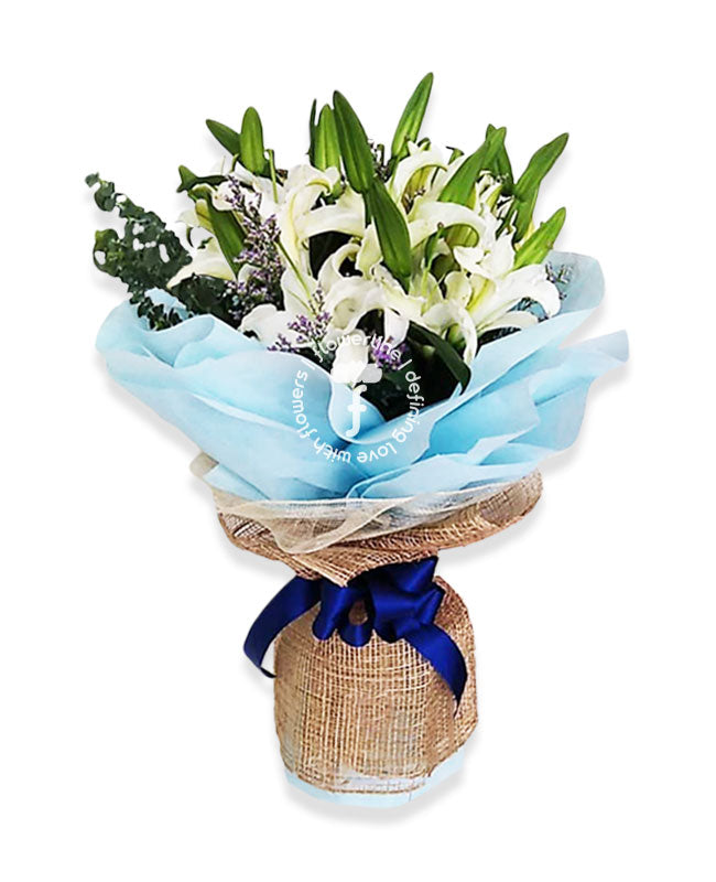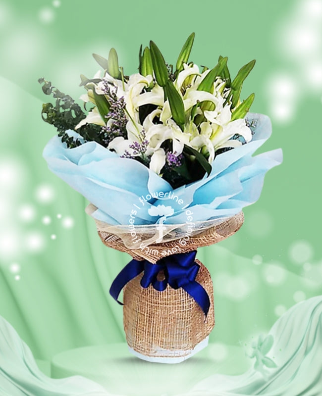 The bouquet comes with 3 stems of Lilies and fillers. The flowers are tied with nonwoven, burlap and abaca wrappers plus a ribbon.